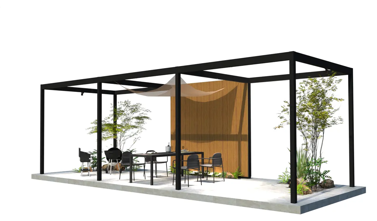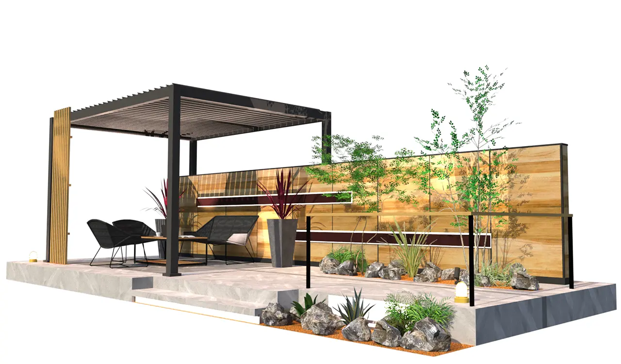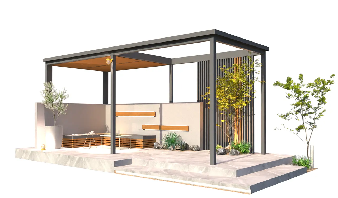 4m×3mの手動開閉パーゴラをメインに背景目隠しに板目4パターン採用。床タイルにアクセントを入れ構成