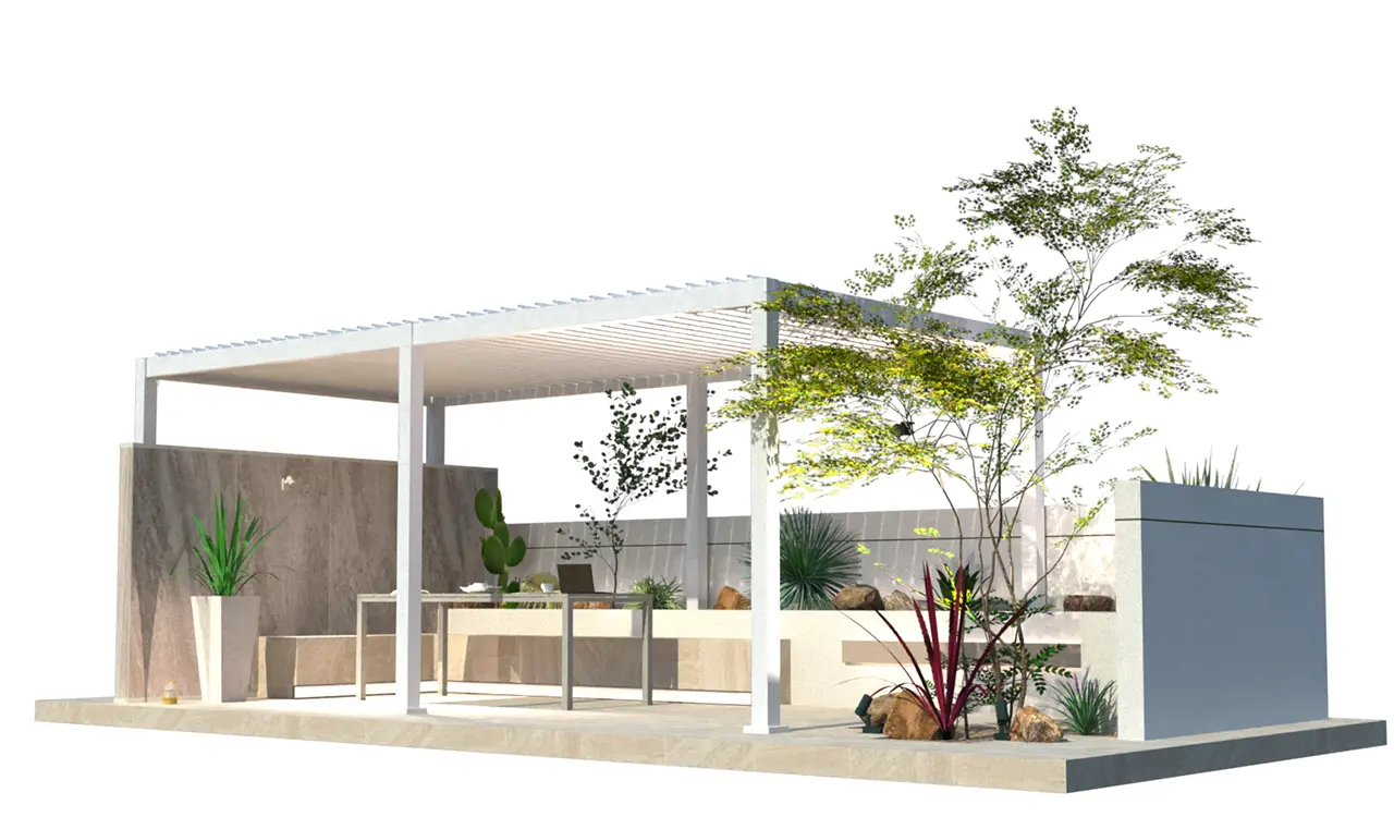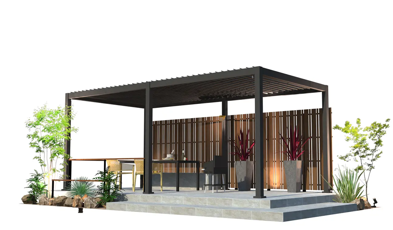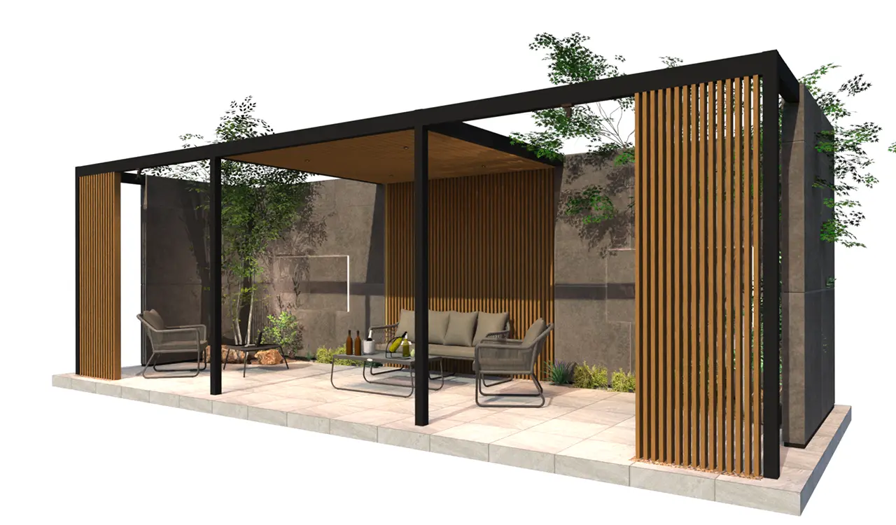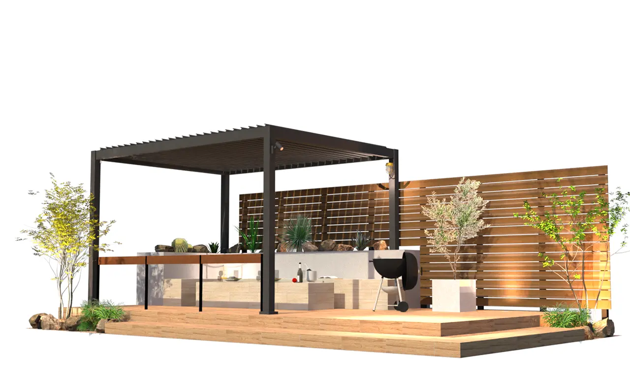 4m×3mの手動開閉パーゴラをメインに背景目隠しに板目4パターン採用。床タイルにアクセントを入れ構成
