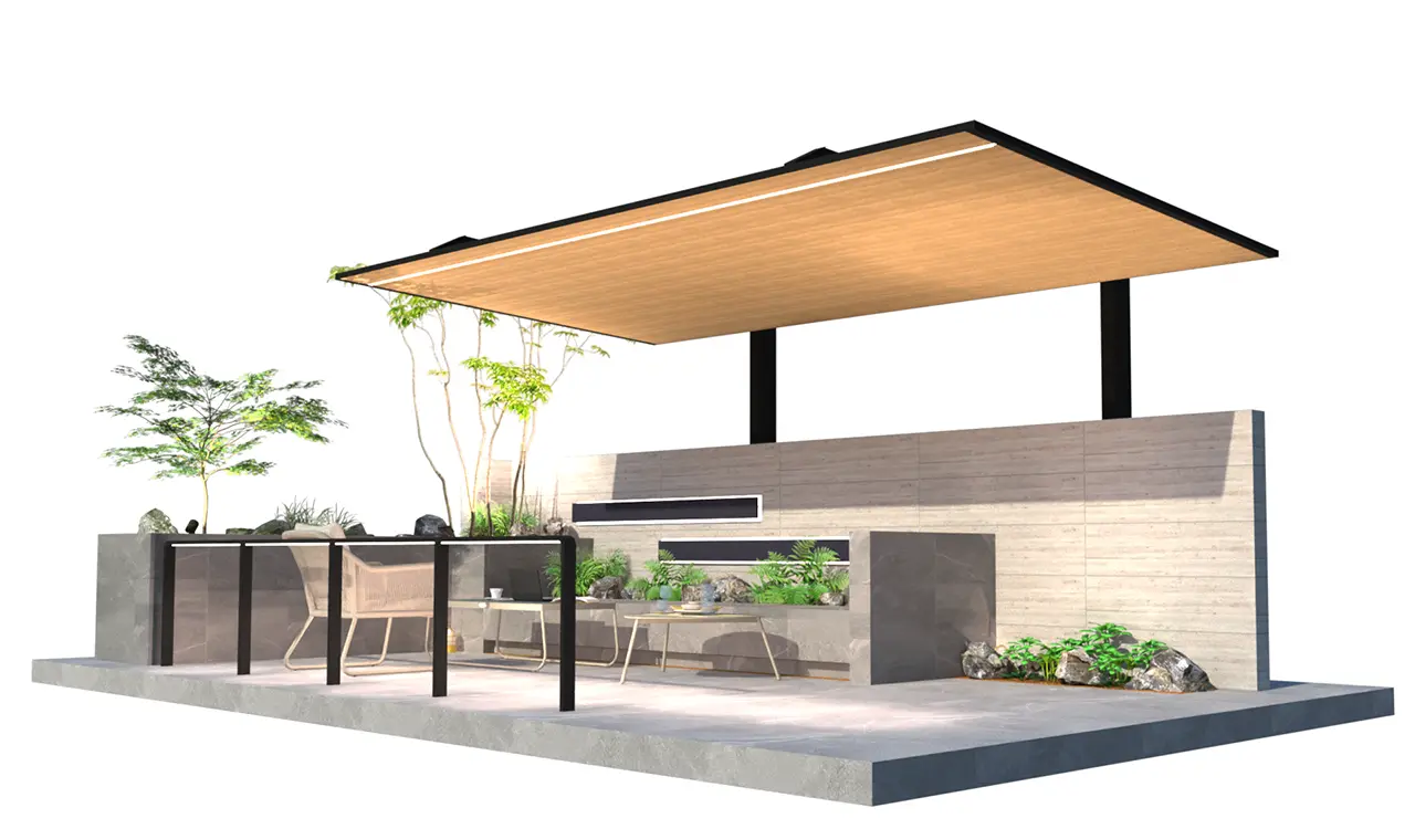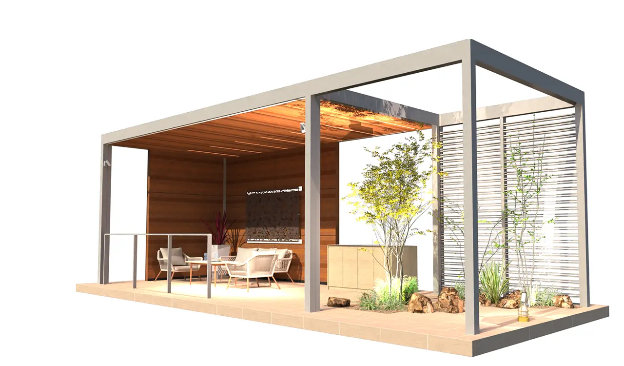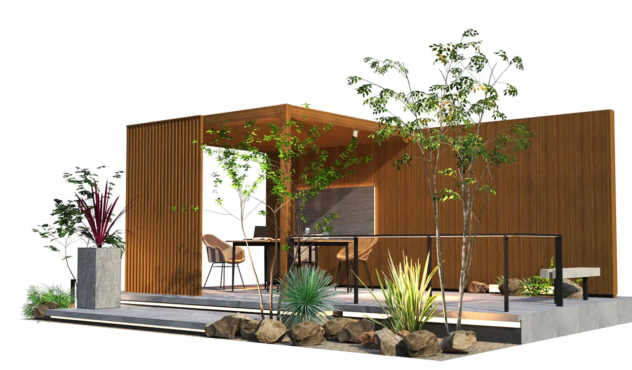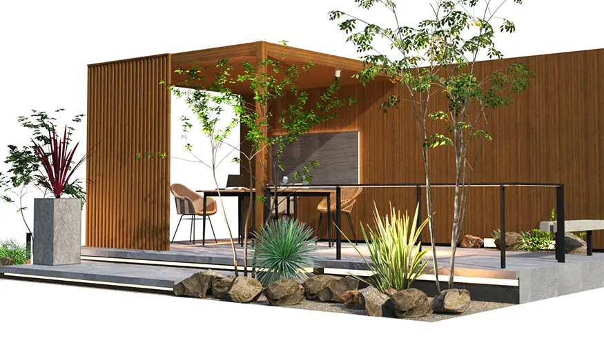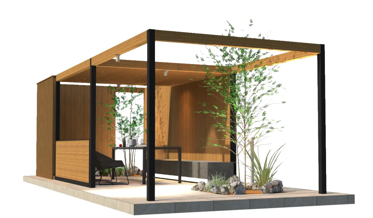 3m×6mの軒天井の背景にL型のプライベートウォール。植栽とガーデンシンクで色付け構成